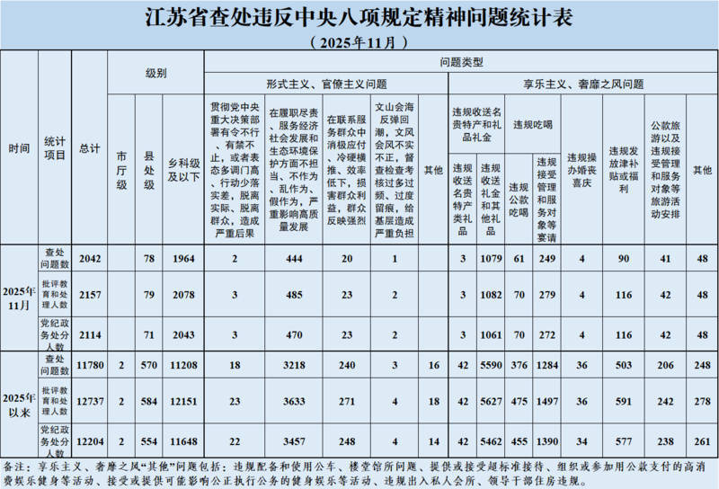 江苏省纪委监委15日通报,2025年11月,全省共查处违背中央八项司法精神问题2042起,品评熟谙和科罚2157东谈主、其中赐与党纪政务责罚2114东谈主。从问题类型看,查处姿色见解、官僚见解问题467起、品评熟谙和科罚513东谈主,查处享乐见解、奢侈之风问题1575起、品评熟谙和科罚1644东谈主。从东谈主员级别看,品评熟谙和科罚县处级干部79东谈主、乡科级及以下东谈主员2078东谈主。(顾敏)