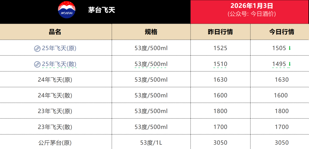 据本日酒价数据流露,1月3日,25年飞天茅台(53度/500ml,下同)批发参考价散瓶报1495元/瓶,较前一日跌15元;原箱报1505元/瓶,较前一日跌20元。